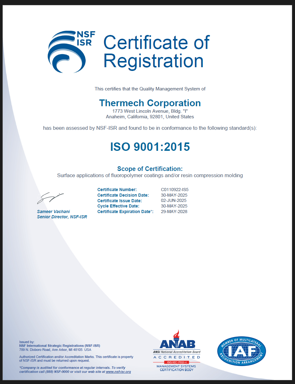 For Thermech customers, quality is priority number one. To meet the demands of today’s sophisticated products and processes, Thermech adheres to rigorous quality-control standards, including ISO 9001:2015 Registered, Chemours Teflon Industrial Licensed Applicator and Whitford Licensed Applicator. We are an approved vendor for NASA and major aerospace companies who perform quality audits at our facilities.